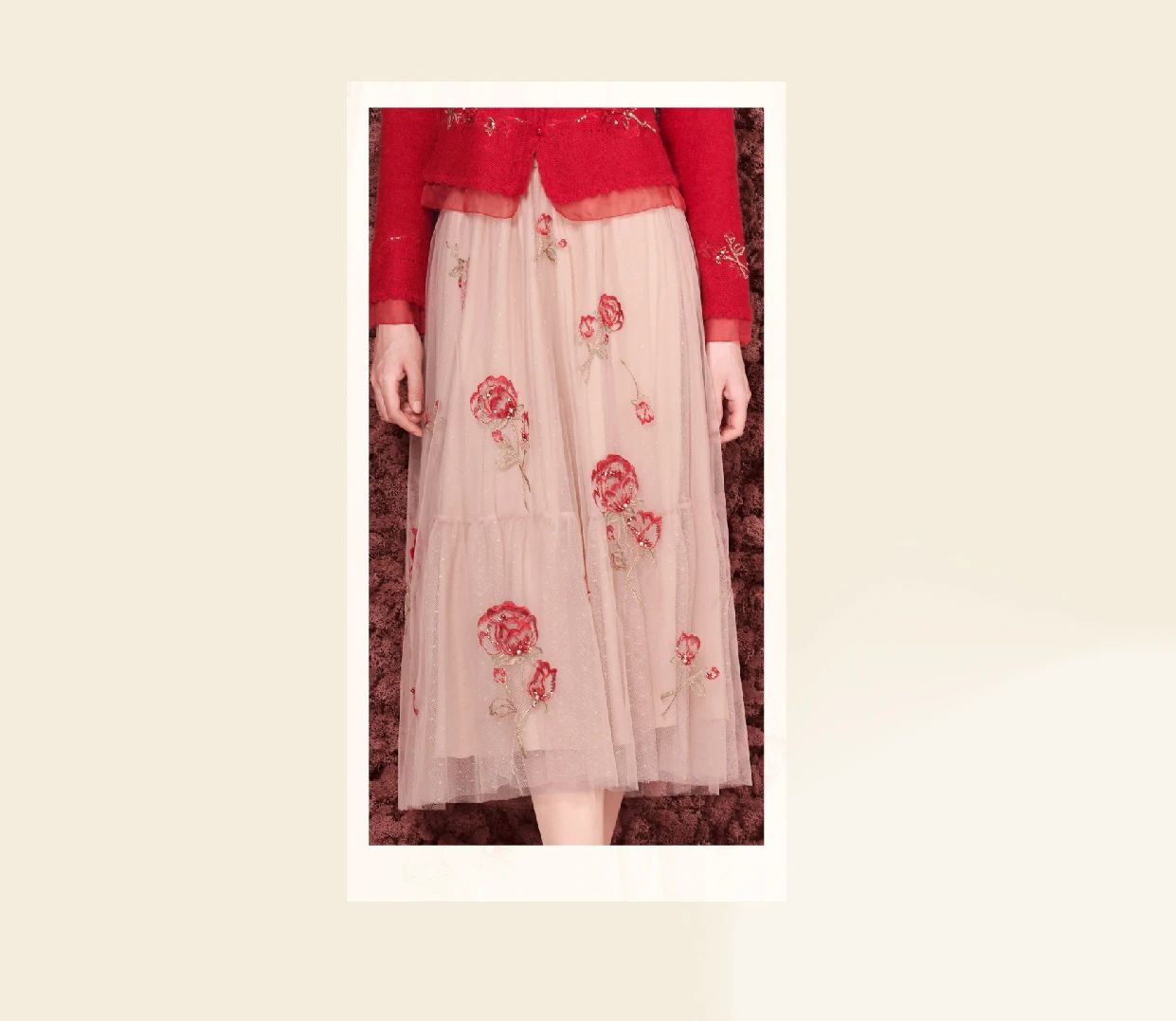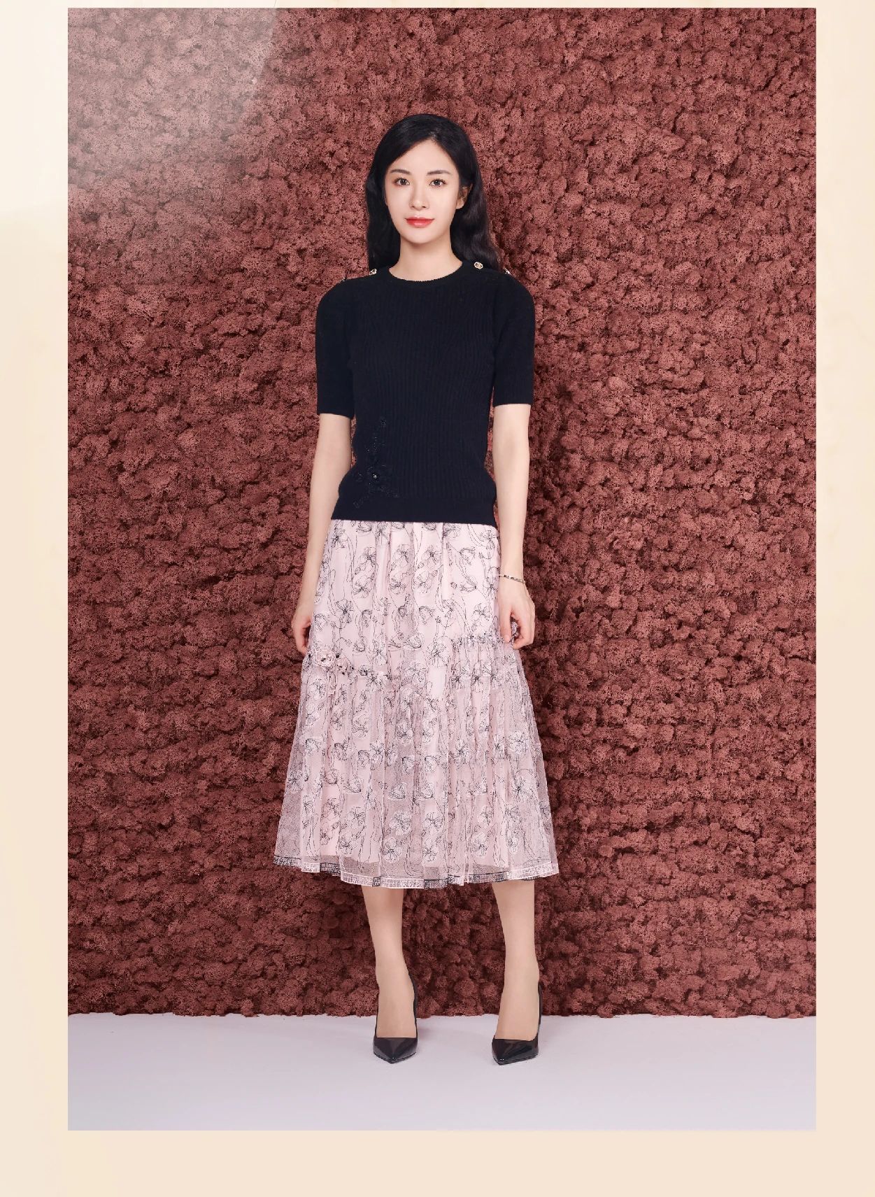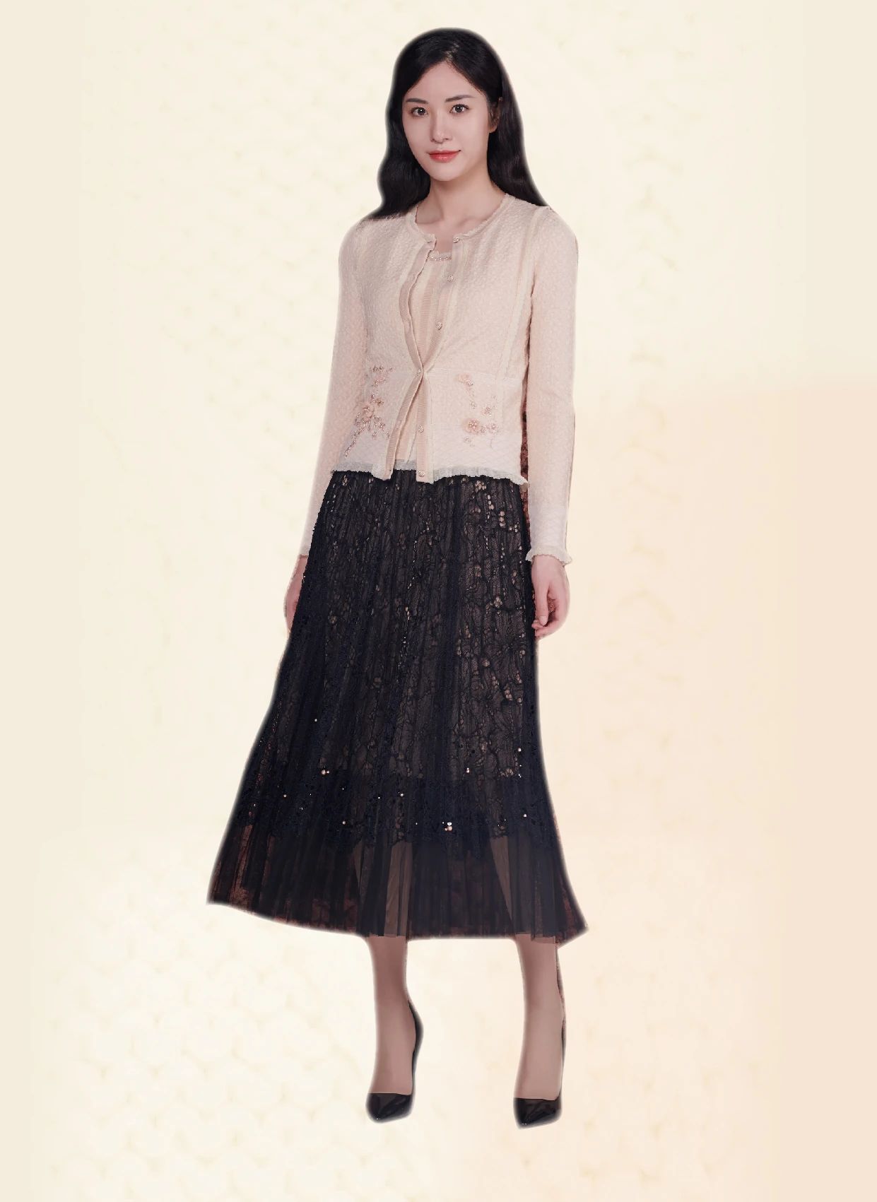 贴花钉珠及下摆和袖口的欧根纱边饰